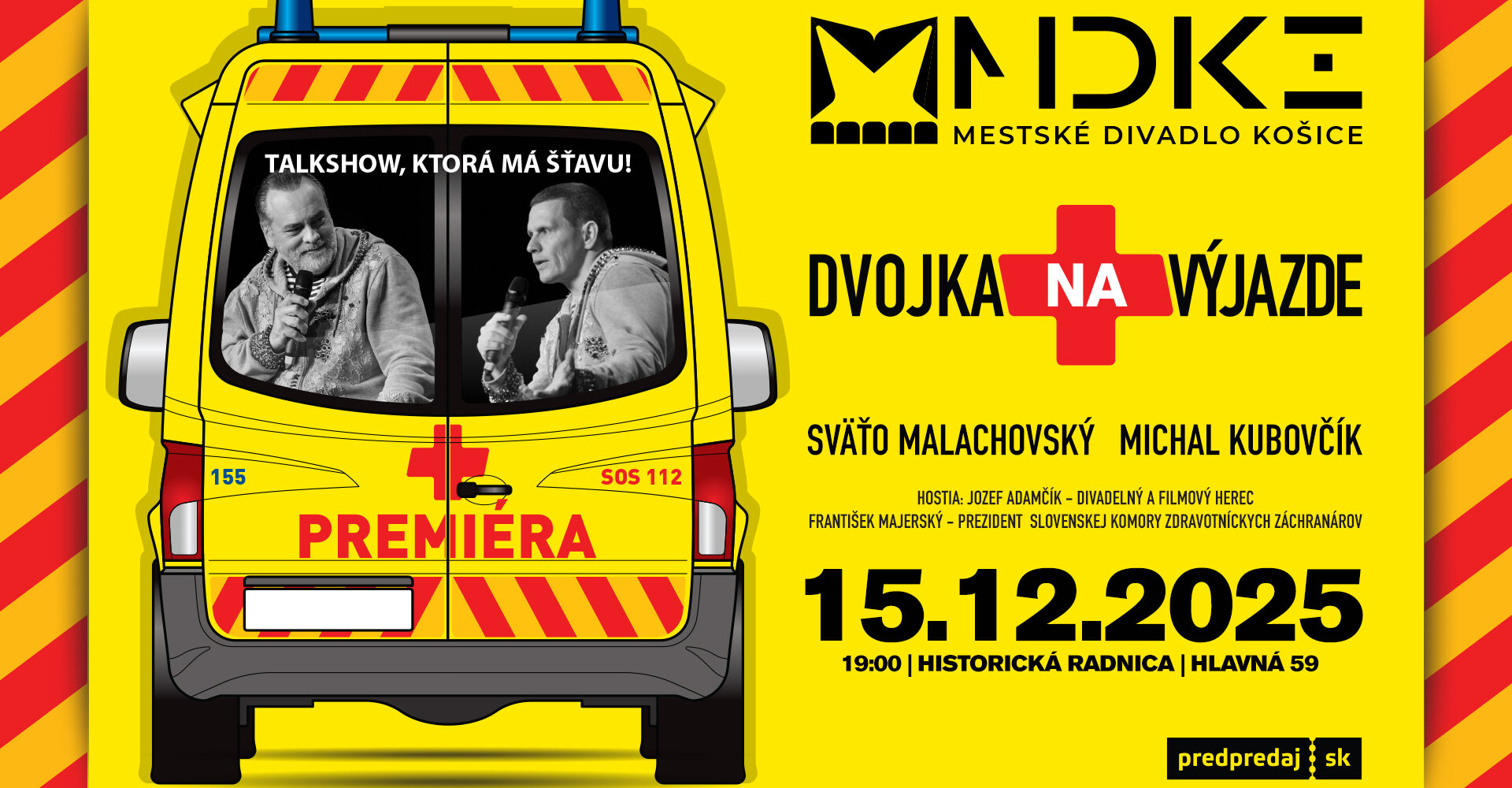 Mestské divadlo Košice pripravuje výnimočný večer, ktorý spojí humor, spontánnosť a inšpiratívne životné príbehy. 15. decembra 2025 sa v Historickej radnici uskutoční premiéra novej talkshow DVOJKA NA VÝJAZDE, ktorou budú sprevádzať obľúbení slovenskí herci a komici Michal Kubovčík a Sväťo Malachovský. Charizmatická dvojica je známa svojou schopnosťou vytvoriť uvoľnenú atmosféru, vďaka ktorej sa hostia prirodzene otvárajú a publikum odchádza nielen so smiechom, ale aj s prívalom dobrej energie a inšpirácie.