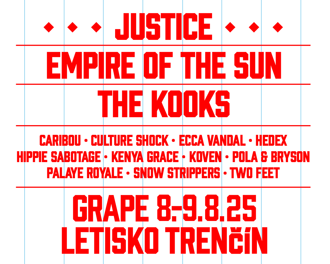 Okrem športových noviniek zostáva Grape verný svojej hudobnej DNA: na deviatich pódiách zahrajú Justice, Empire of the Sun, The Kooks, Two Feet, Caribou a mnoho ďalších svetových i domácich interpretov. Viac informácii sa dozviete priamo na stránke festivalu.