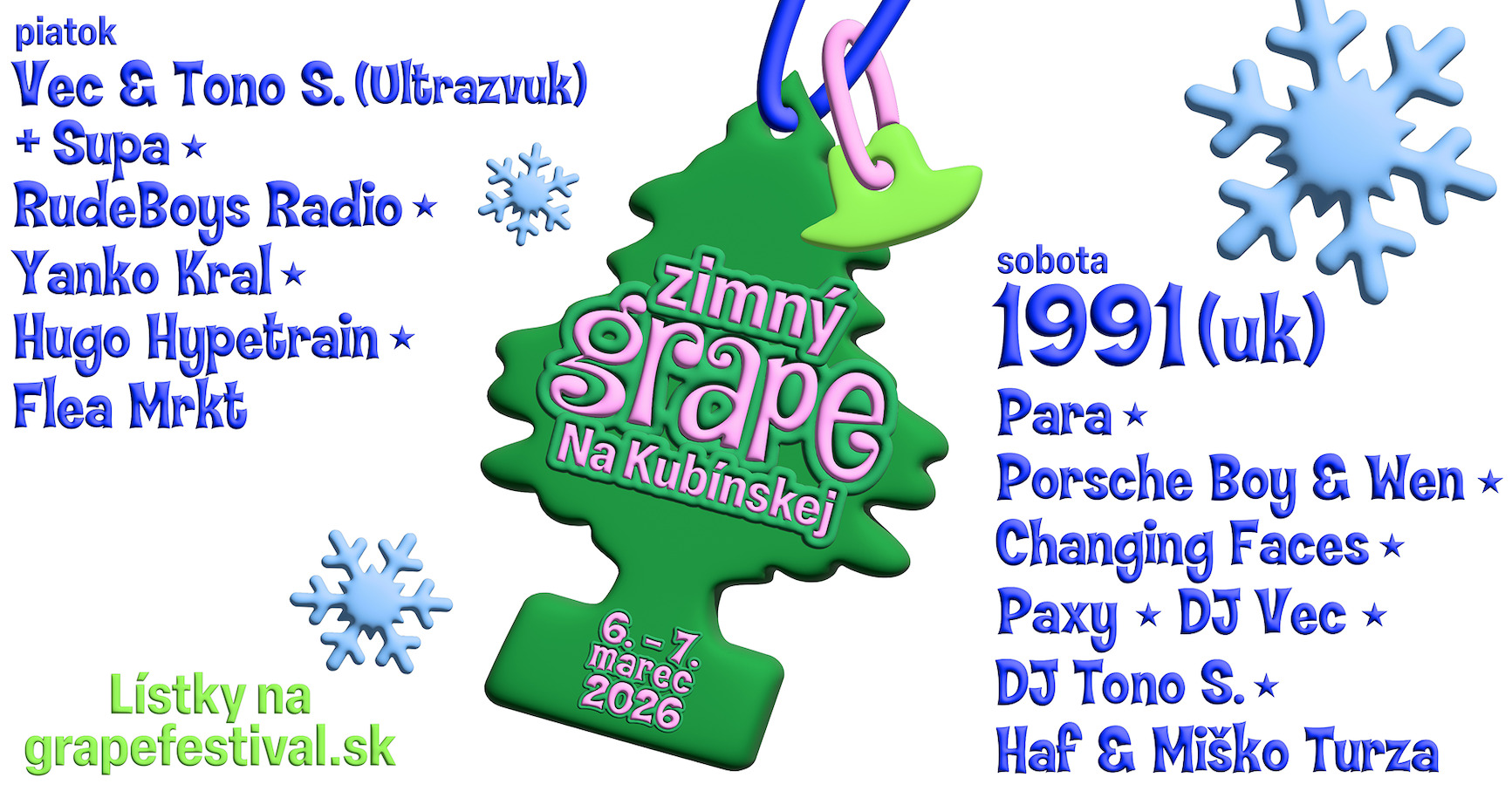 Zimná edícia festivalu Grape sa vracia 6.–7. marca 2026 už po tretíkrát na Kubínsku hoľu a tak ako minulý rok, s dvojdňovým programom. Najväčšou novinkou je prvý zahraničný headliner – britský drum and bassový producent 1991, ktorý roztancuje sobotnú noc spolu s Changing Faces a Paxy. Počas víkendu vystúpi aj Para, Porsche Boy & Wen, VEC & Tono S. (Ultrazvuk) + Supa, RudeBoys Radio, Yanko Kral a ďalšie mená. Nebudú chýbať športové aktivity, skialp na Vrcholovku, gastro zóny a tanečné sety na svahu.